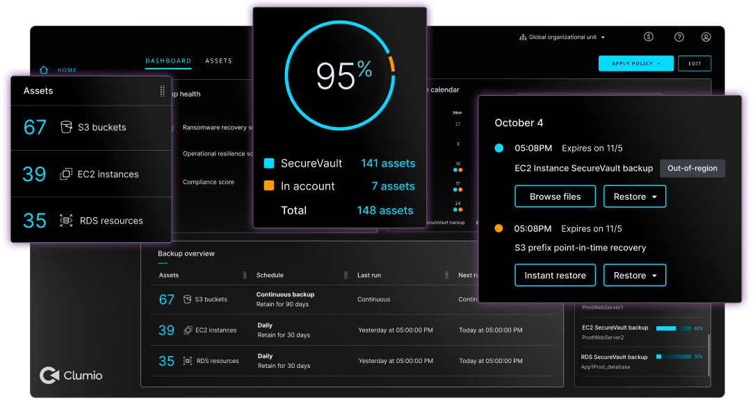 Clumio is purpose-built for AWS and integrates natively with services like Amazon S3, S3 Tables, DynamoDB, RDS / Aurora, EBS, and EC2. It can automatically discover and protect workloads without agents or additional infrastructure, helping you simplify management and maintain resilience at scale.