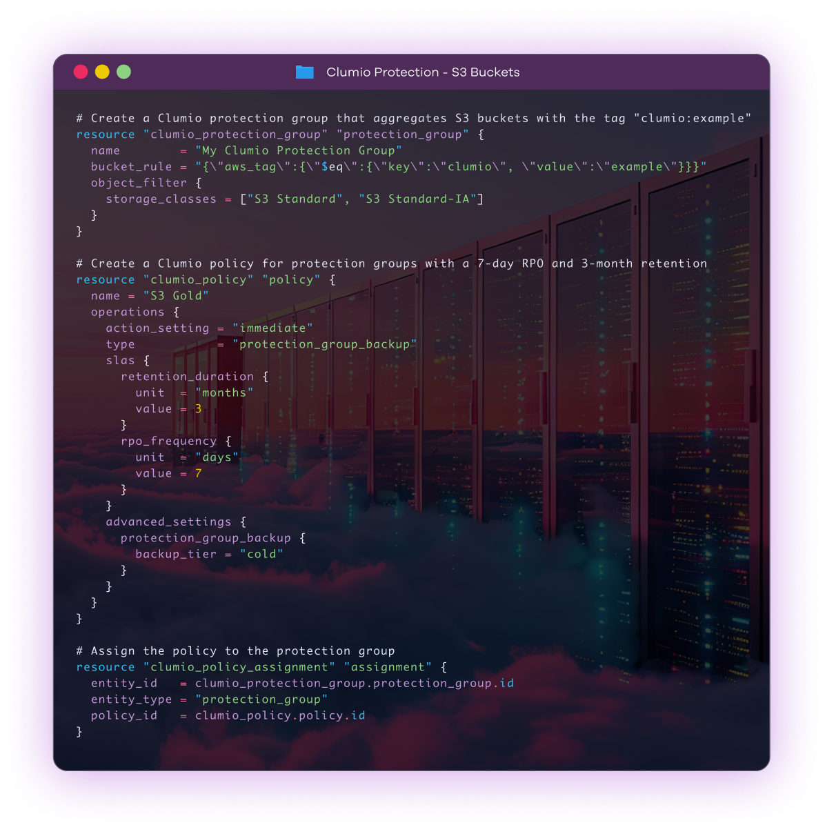 Clumio helps make automating backups simple, designed to save valuable time. You can schedule and manage automated backups directly within the Clumio application. For developers, our Terraform provider allows you to deploy and manage your backup strategy as code, integrating with existing workflows.