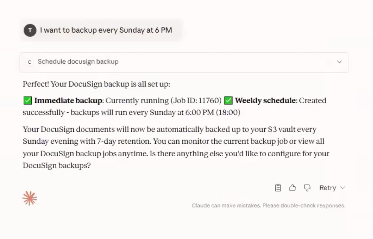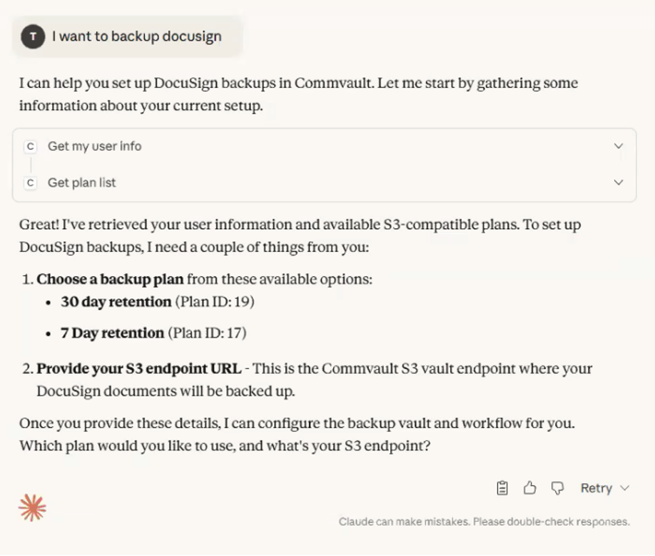 Commvault’s demo shows how a user can back up Docusign data simply by talking to Claude.