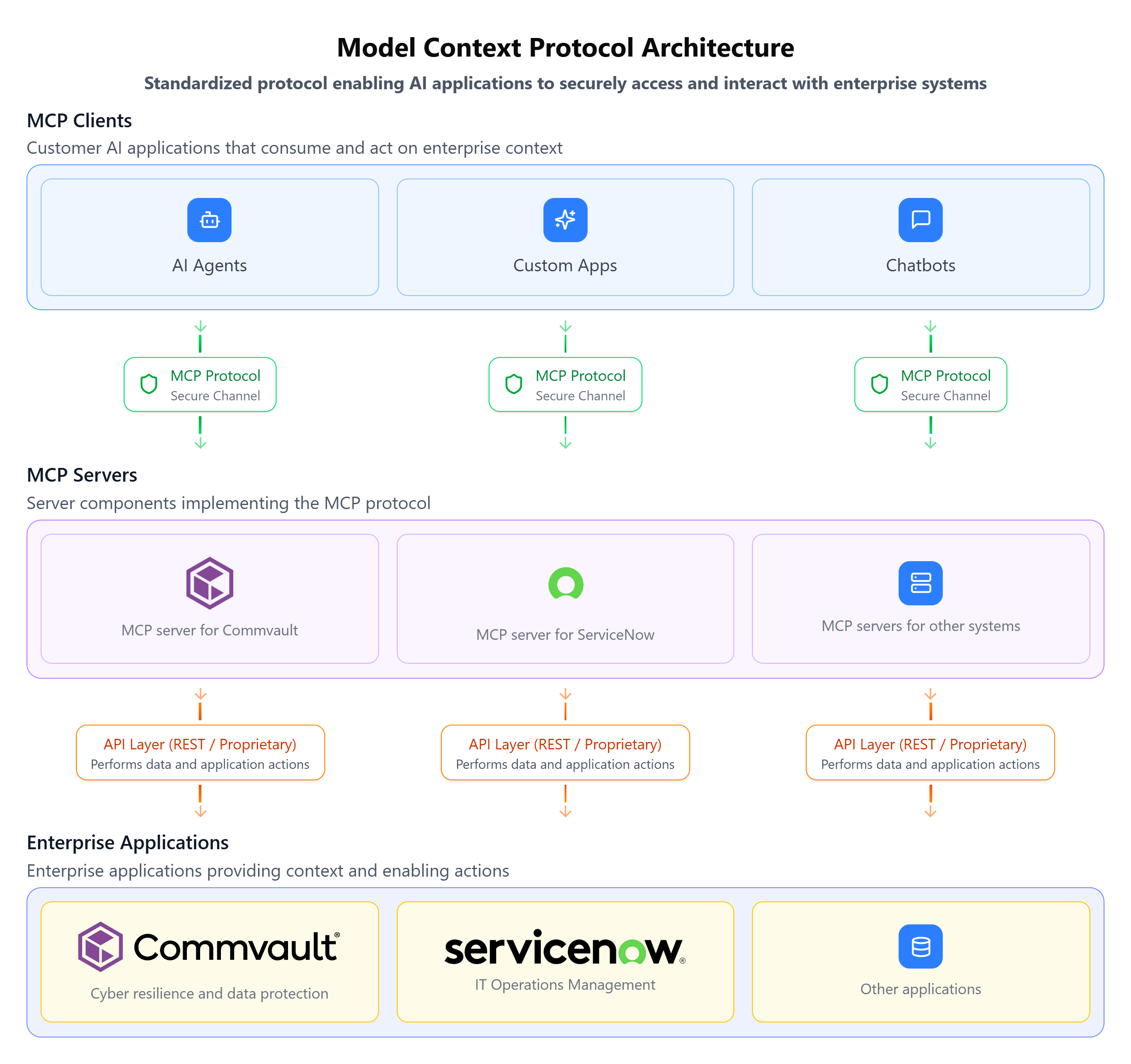 MCP is an open standard introduced by Anthropic that defines how AI assistants can safely interact with external systems. Commvault’s MCP server implements this standard to connect Commvault Cloud with gen AI assistants – enforcing authentication, access, and encryption at every step.