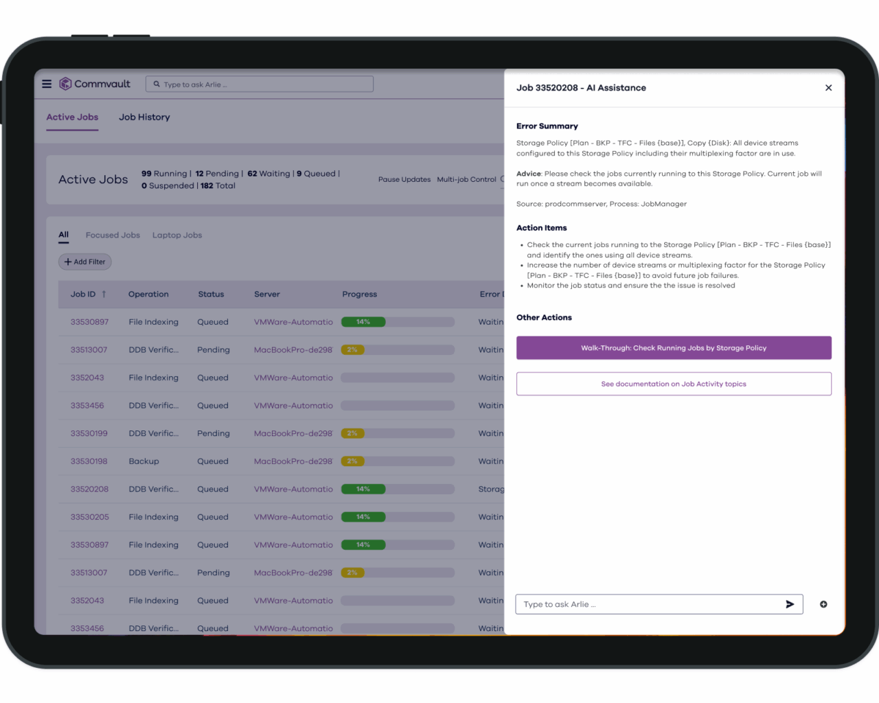 AI troubleshooting to help discover operational issues in Commvault Cloud. Get insights, recommendations, and steps to resolve job issues.