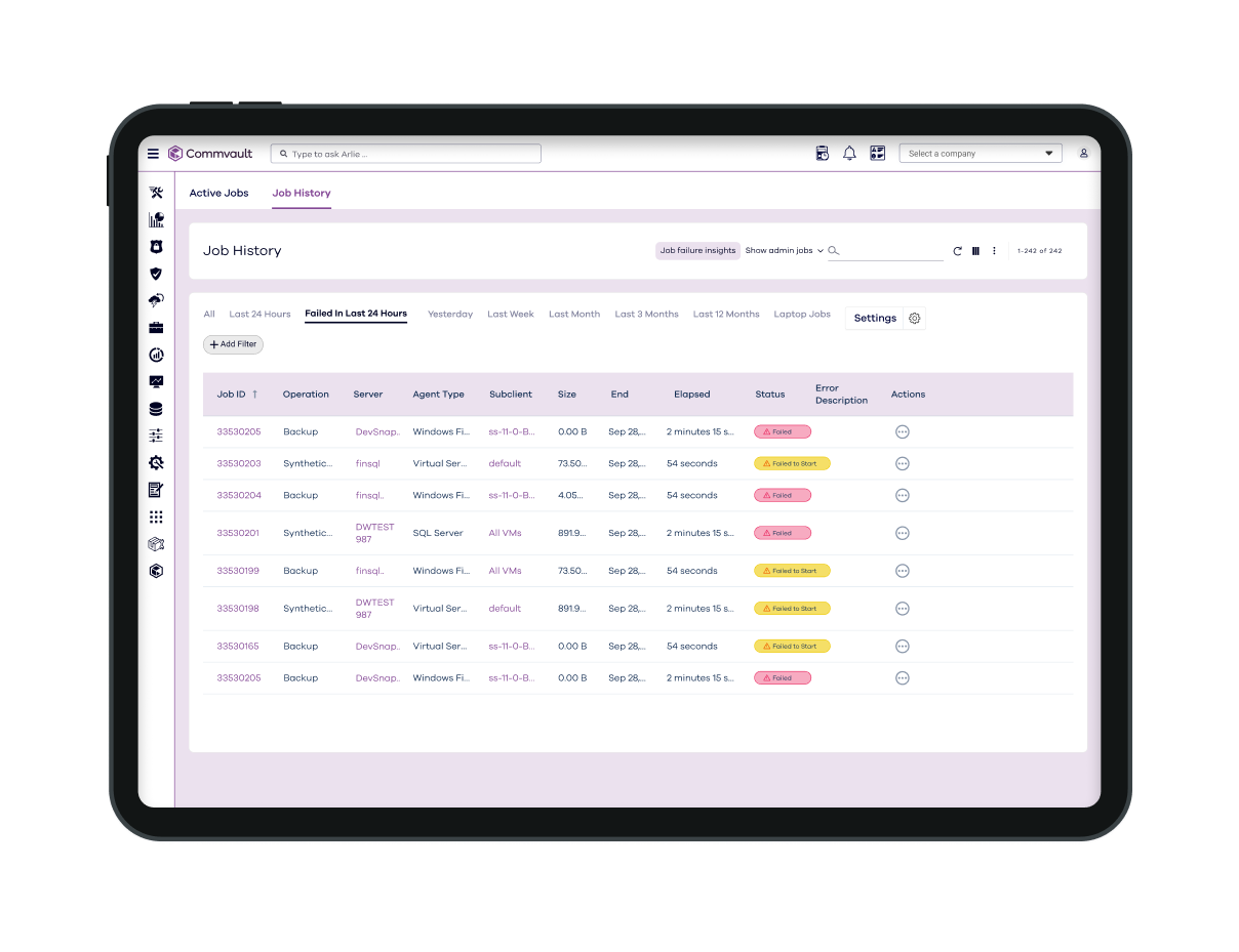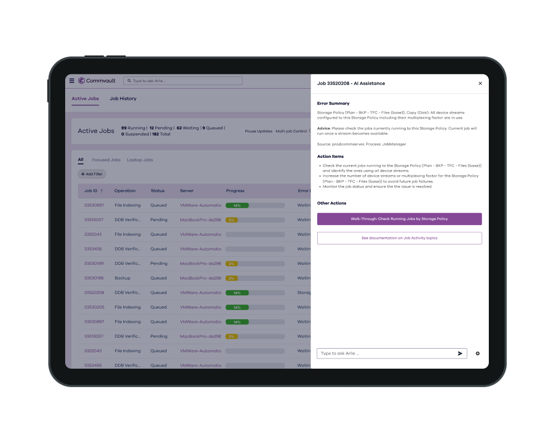 AI troubleshooting to help discover operational issues in Commvault® Cloud. Get insights, recommendations, and suggested steps for resolving job issues.